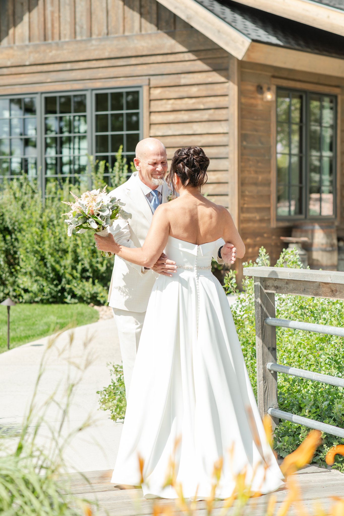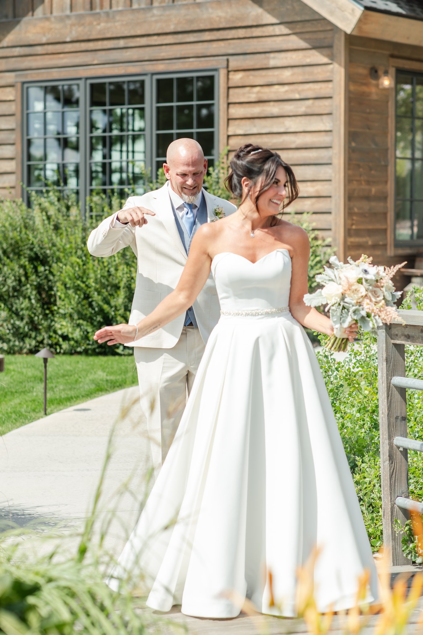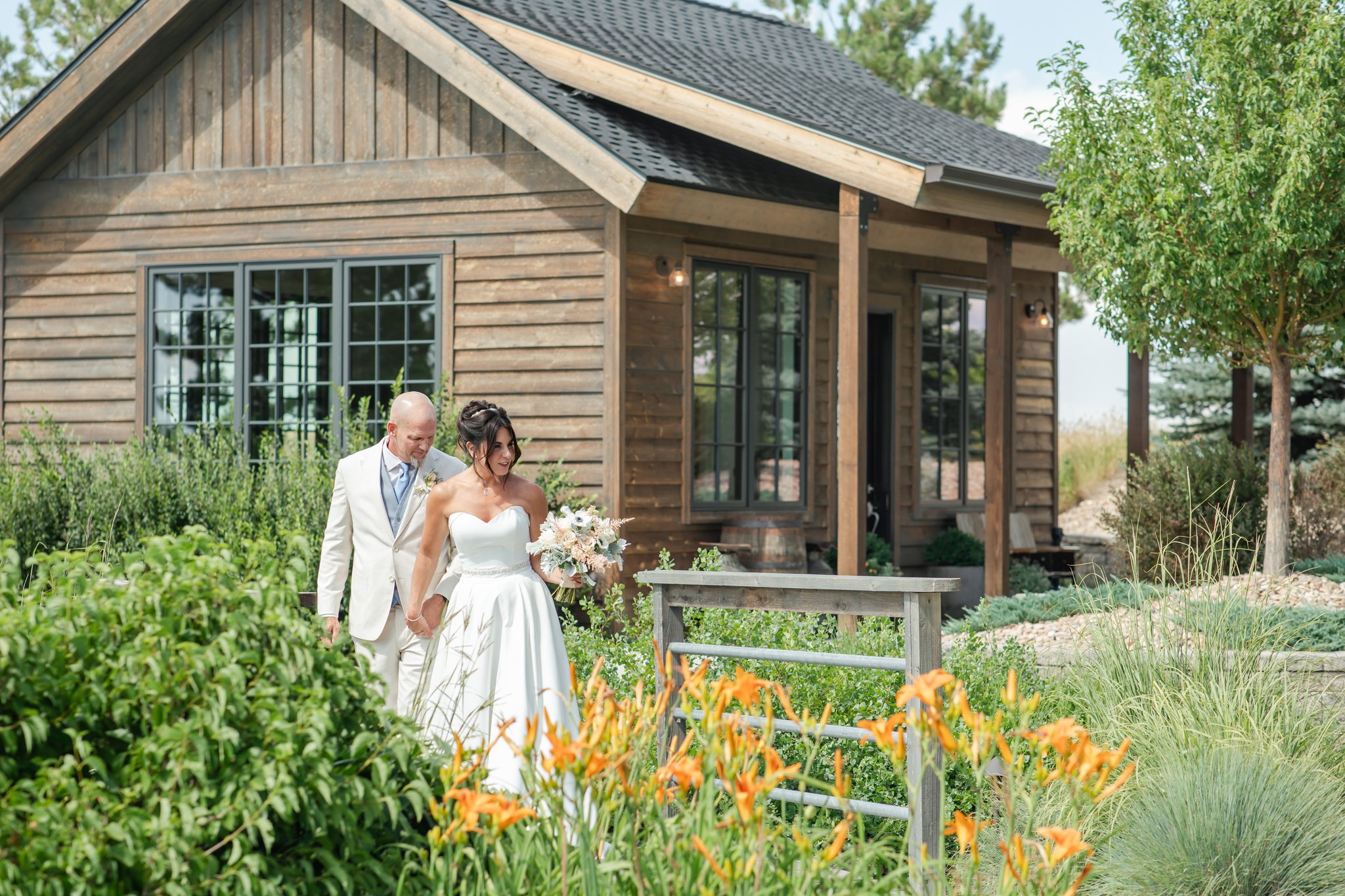 Out past the hustle of Denver sits the most quaint, stunning wedding venue. Bonnie Blues has a history, a story, and was just what Matt and Renee were wanting. It is modern, rustic, and elegance in one. Bride and groom each have their own suite complete with a wet bar, plenty of mirrors, and chic accents. Options for ceremony include a newly built greenhouse or outdoor gazebo with mountains in the distance. For reception, walk into their expansive dining area that can also double as a dance floor. But it’s the attention to detail that really elevates this venue. The landscape is lush with flowers and trees. There is a putting green, an outdoor dance space with string lights, wooden bridge, and fire pits. Find a vintage pickup and windmill for epic photo locations.