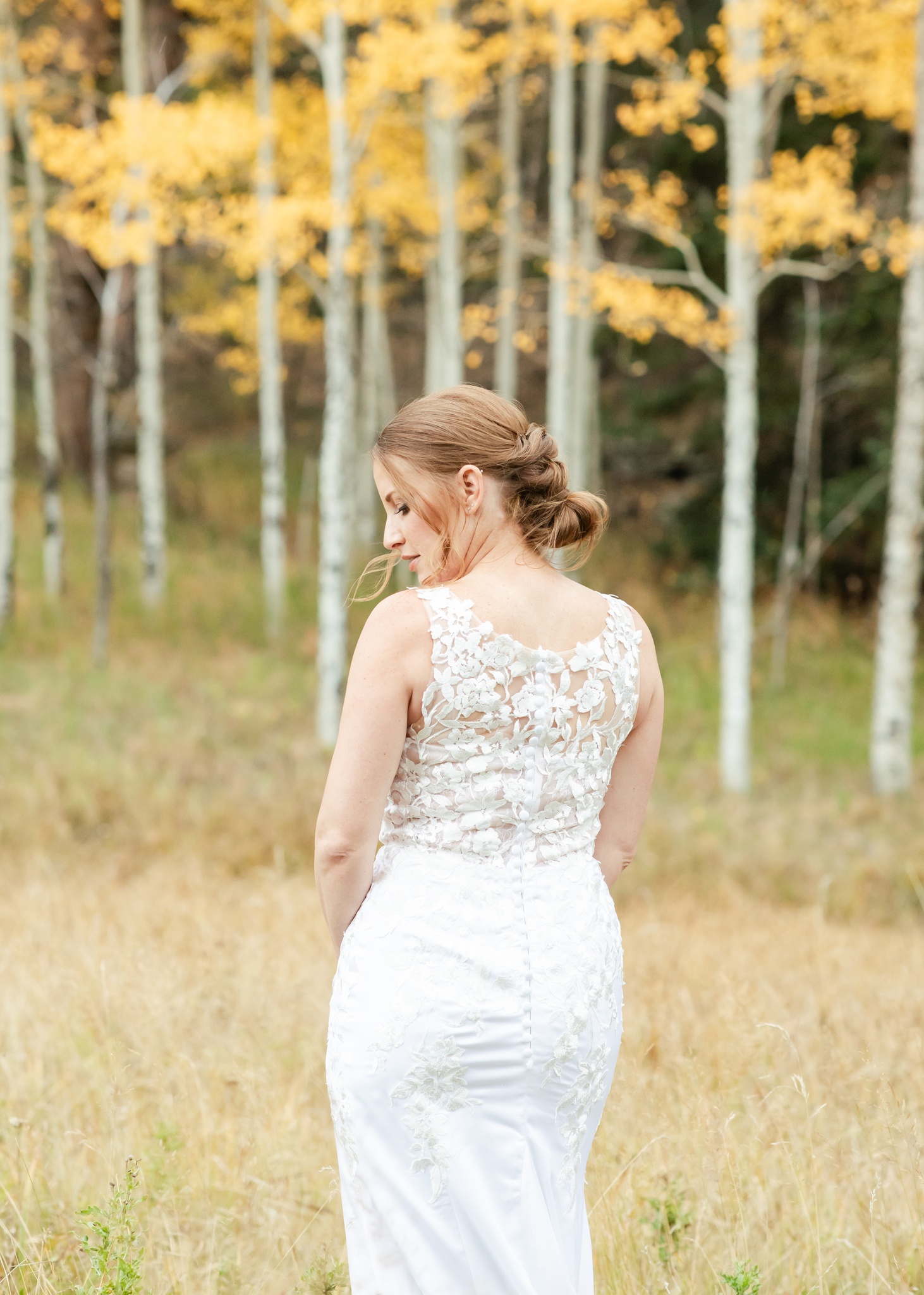 Bride standing with a hand on her hip by golden aspen trees during fall in Colorado.