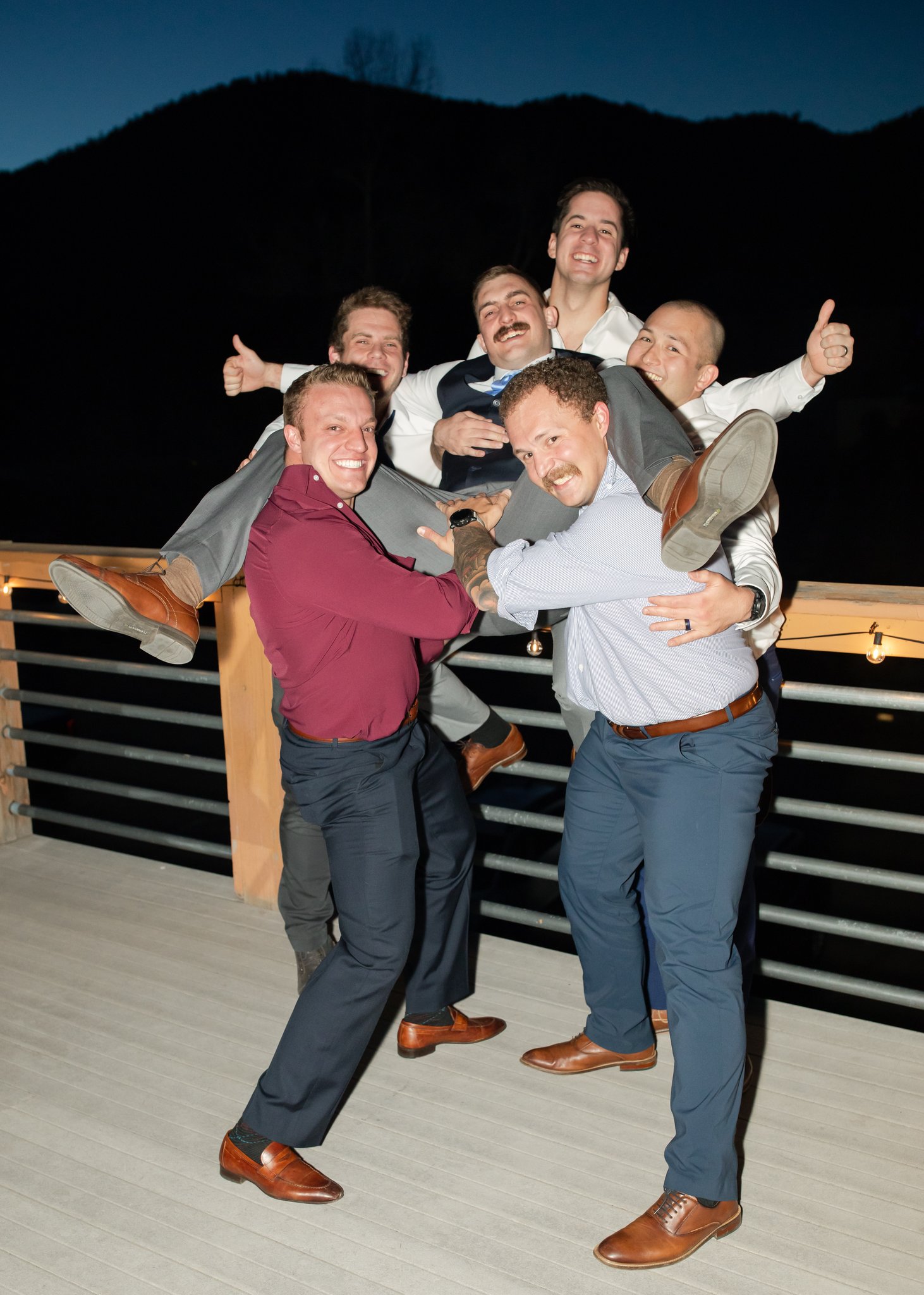 A group of guys hoisting Erik off the ground.